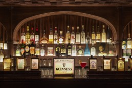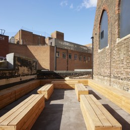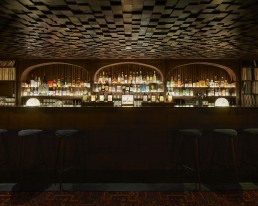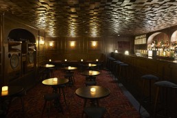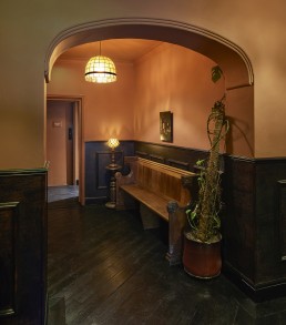 Built by architect George Somers Leigh Clarke in a style described as ‘freely inventive’ neo gothic with Flemish touches, respect for the history and character of the building led the design process. In turns neo gothic, Victorian and Arts and Crafts, the individual spaces in the building draw on their modern touches to add a layer of individuality and escapism to the venue. Features such as diagonally laid reclaimed flooring, monochrome palates , wooden panelling with 70’s wall lights and the centrepiece textured ceiling combine traditional and modern in a Lynchian blend of liminal spaces, contemporising the building.