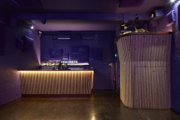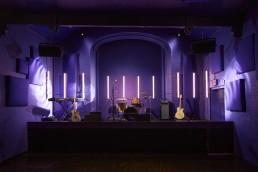 A trusted partner was brought in to consult on both sound system design and acoustic treatment of the spaces advising on the types of treatment and zones where it would be most effective. The walls in the venue space are dotted with absorption panels at primary and secondary reflection points and above the stage is an arch of panels to remove reflections on stage prior to being picked up by the microphones. The stage itself is triple reinforced and the surface contains a sandwiched layer of heavy sand to damp vibrations at the source. The ceiling feature in the downstairs bar acts as a room wide diffuser, scattering reflected sound. All of the seating has sound absorbing material held in grills beneath the benches to trap low end reflections and noise all culminating in an excellent listening experience.