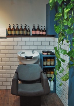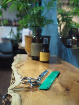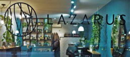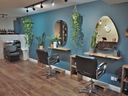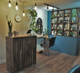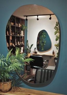 Lazarus eco salon was a blank canvas project with limited space and we were able to make a lot of bespoke elements for the project. Commercial grade flooring was installed before a partition wall was put in to separate the colour mixing area and kitchen from the client waiting area- The wall features retail display shelving on the client facing side and a colour organising storage system on the reverse. Most of the furniture in this project was designed and made from reclaimed wood to fit the environmental focus of the clients business – the counter however was made from wind felled yew which was planed and cut to fit the space. The bespoke mirrors were all hand cut to freehand drawn designs and are floated away from the wall.